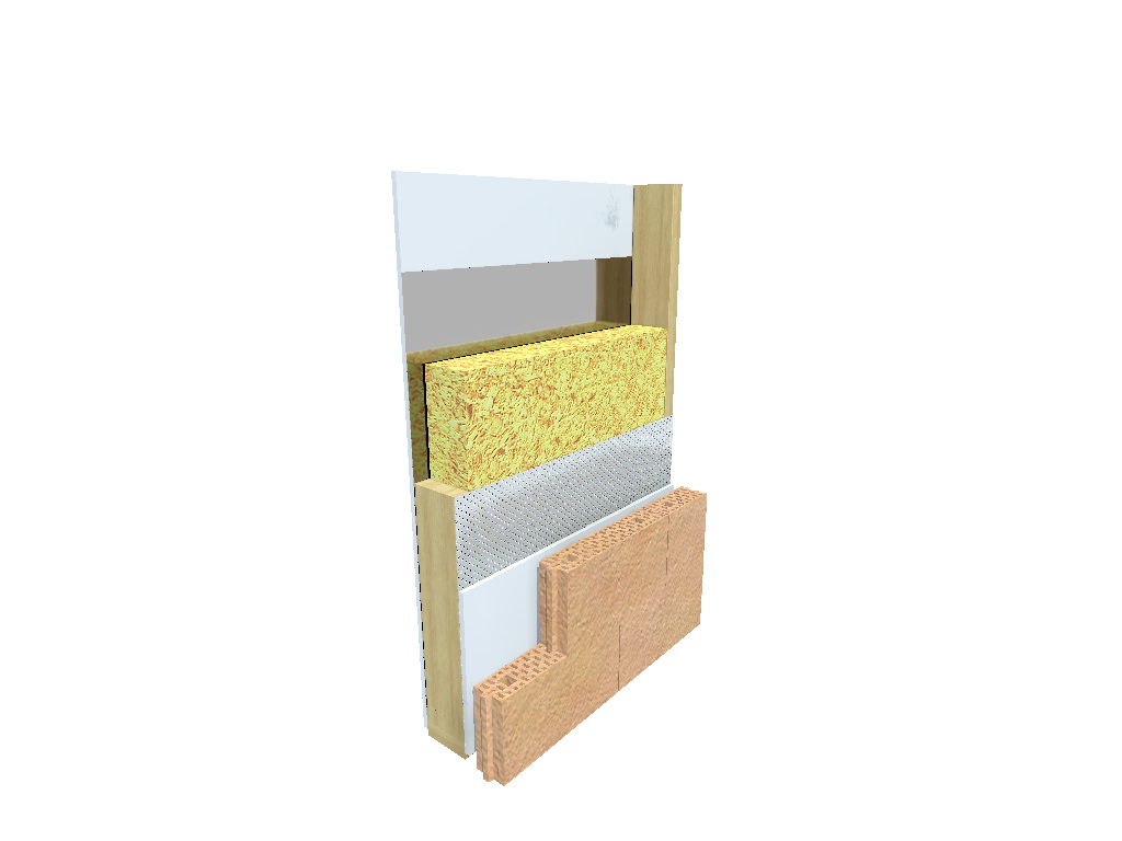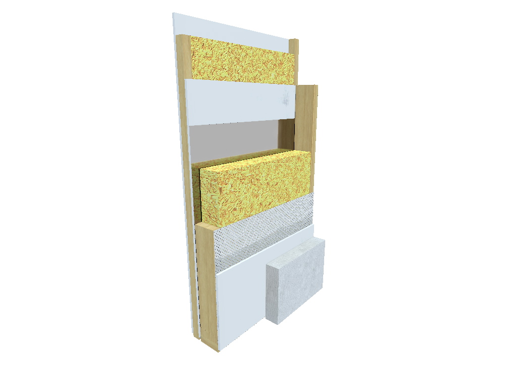 Belső főfal: 5 x 15 cm hőkezelt, hossztoldott ragasztott favázszerkezet, közte 15 cm vastag Ursa VL üveggyapot szigetelés, mindkét oldalt gipszrost borítással.