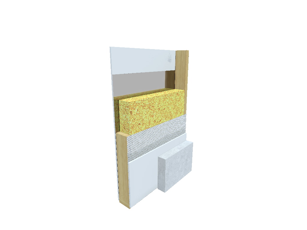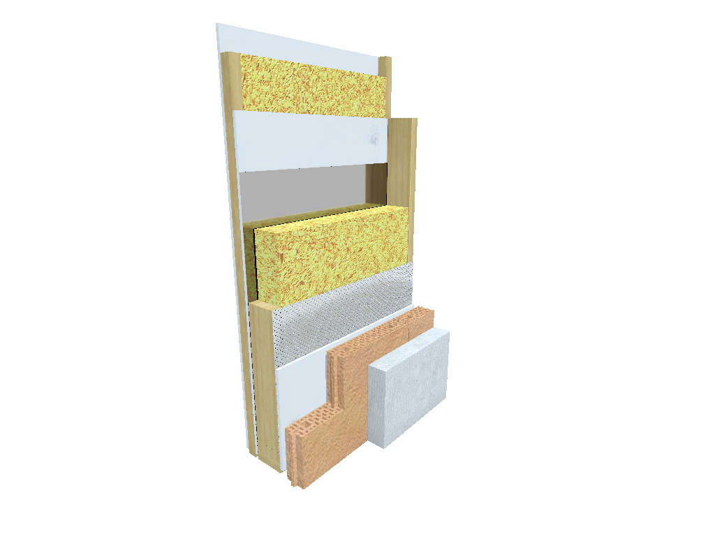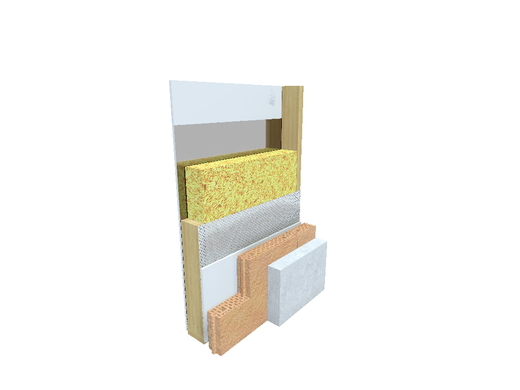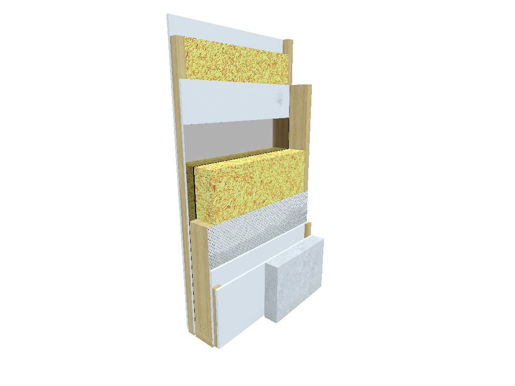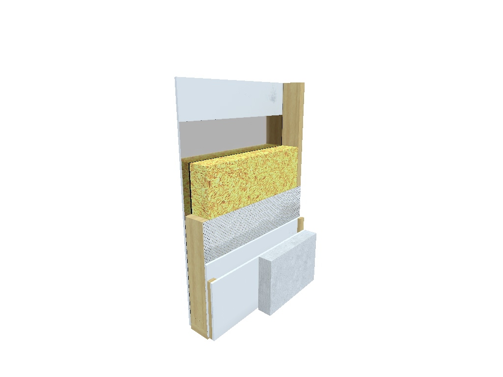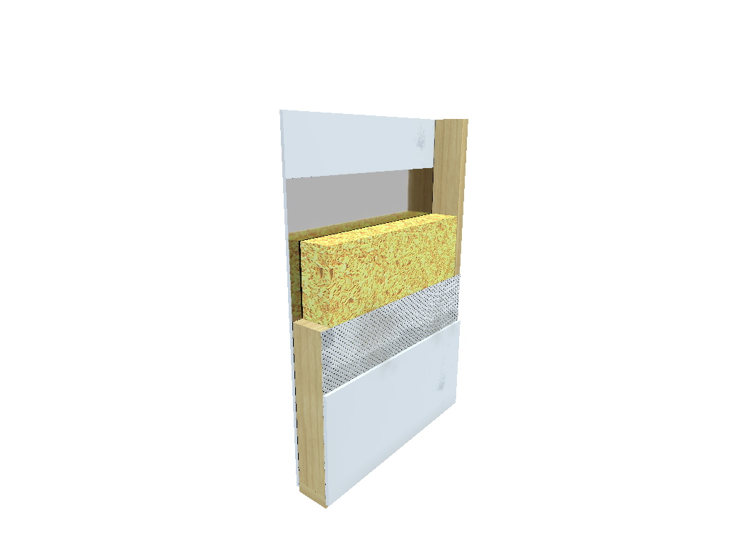 Válaszfal: 5 x 10 cm hőkezelt, hossztoldott ragasztott favázszerkezet, közte 10 cm vastag Ursa VL üveggyapot szigetelés, mindkét oldalt gipszrost borítással.